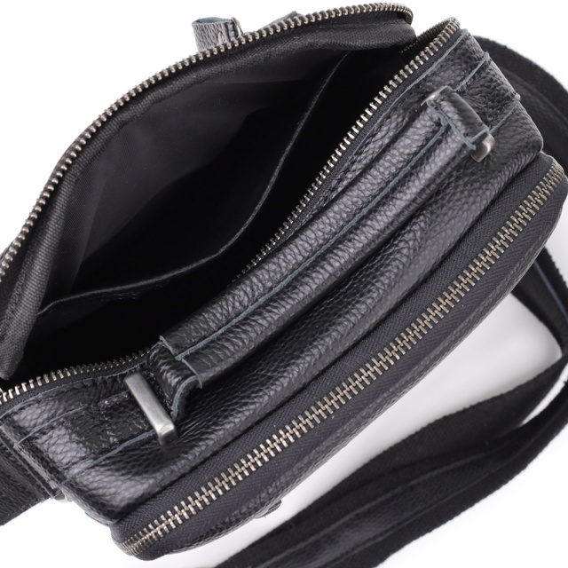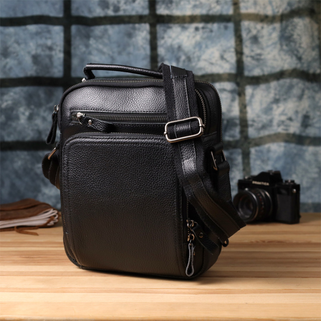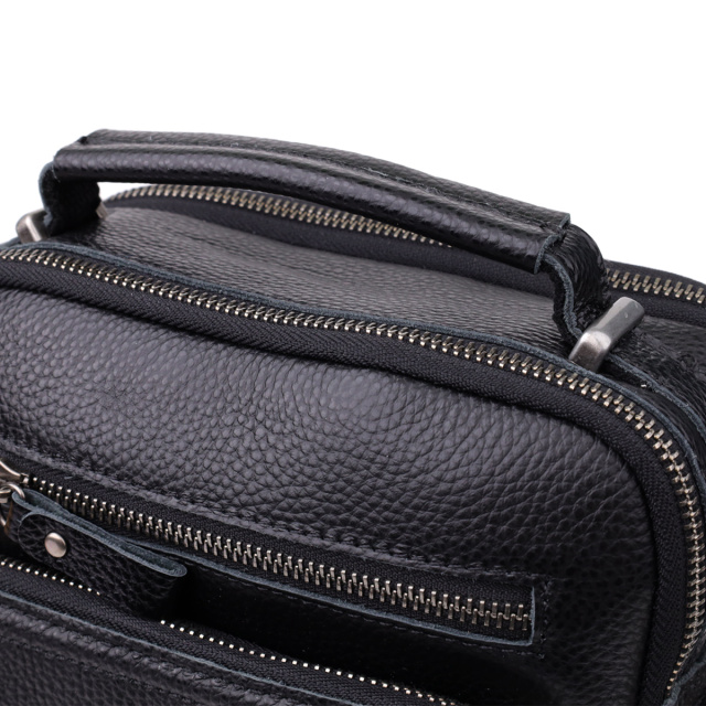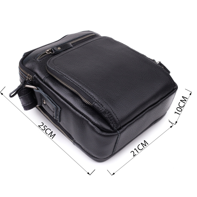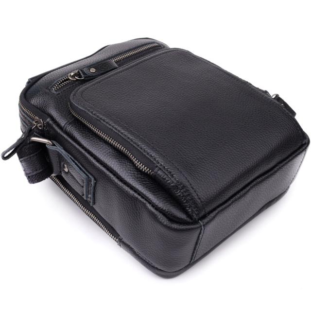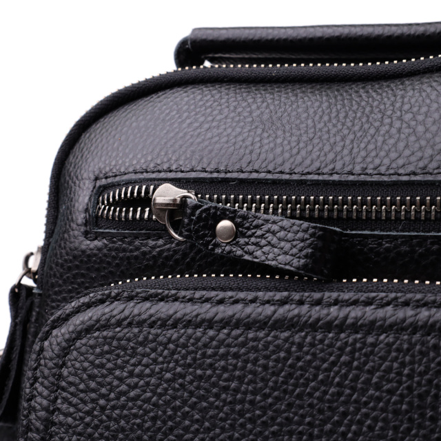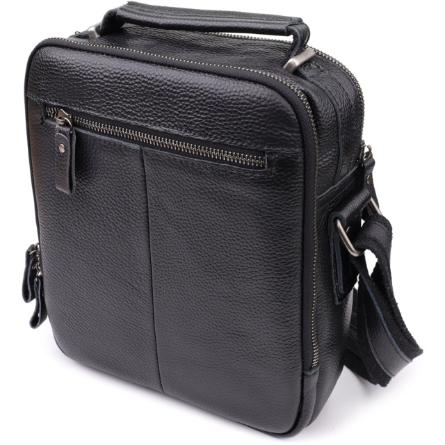 Черная кожаная сумка на плечо — практичный и стильный аксессуар для повседневного использования. Модель выполнена из натуральной зернистой кожи флотар, устойчива к износу и сохраняет аккуратный внешний вид. Оснащена двумя основными отделениями на молнии, в одном из которых предусмотрен потайной карман. На лицевой стороне размещены накладной карман на молнии и горизонтальный встроенный карман. На тыльной стороне — удобный карман на молнии. Сумка дополнена прочной кожаной ручкой и регулируемым несъемным кожаным ремешком для ношения на плече. Фурнитура цвета серебра придает модели сдержанную элегантность.