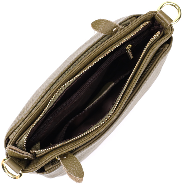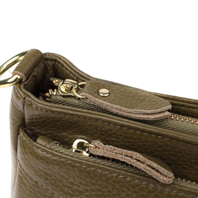 Фурнитура выполнена в цвете жёлтого золота, что выгодно подчёркивает природную глубину оливкового оттенка и добавляет сумке элегантности и тепла.