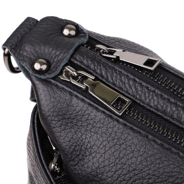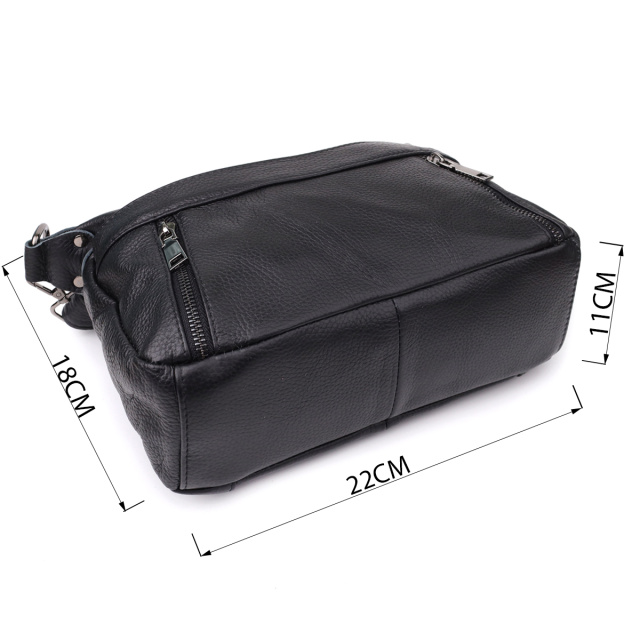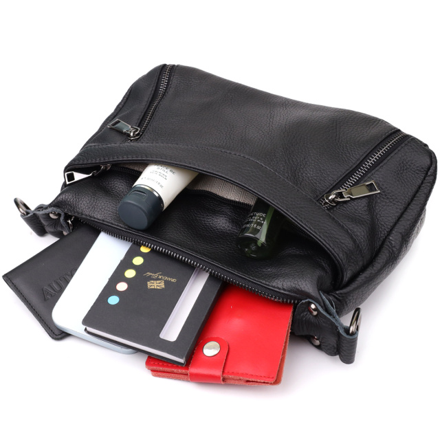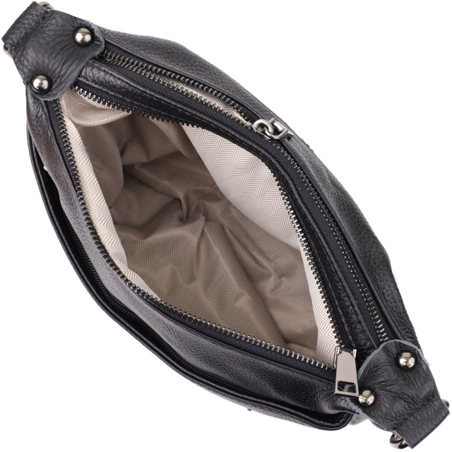 Сумка оснащена двумя основными отделениями на молниях, что позволяет удобно распределить содержимое. Внутри находятся потайной карман на молнии и два кармана открытого типа — для мелочей, телефона или ключей. На лицевой стороне предусмотрено сразу три функциональных кармана: один горизонтальный на молнии и два вертикальных — также на молниях, что придаёт модели динамичный, современный вид. На тыльной стороне — дополнительный карман на молнии для быстрого доступа к важным вещам.