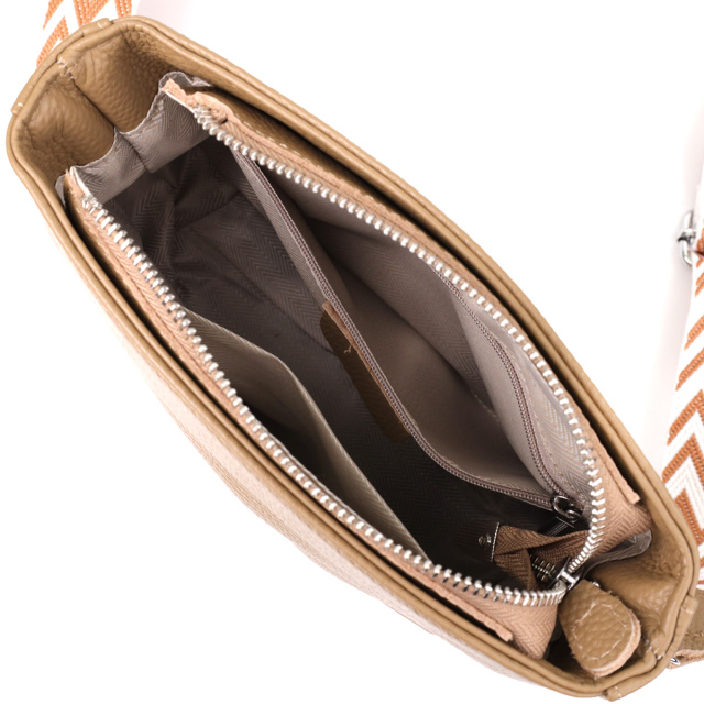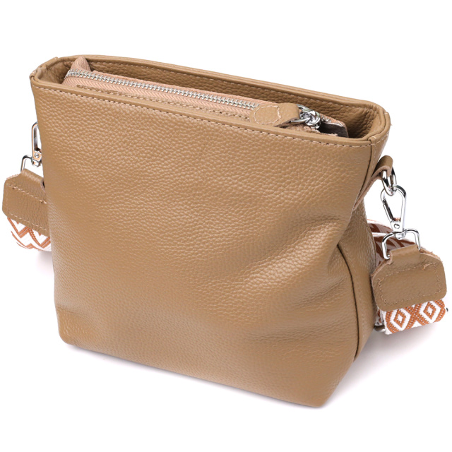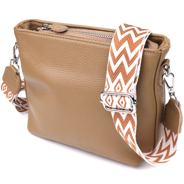 Мягкий бежевый оттенок придаёт сумке утончённость и делает её легко сочетаемой с одеждой в любом стиле — от классики до кэжуал. Фурнитура в серебристом цвете добавляет легкий контраст и подчёркивает сдержанную элегантность аксессуара. Съёмный текстильный ремень позволяет носить сумку на плече или через плечо, обеспечивая комфорт даже при активном ритме жизни.