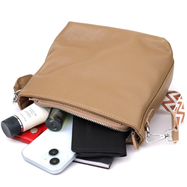 Практичная и одновременно изысканная, эта бежевая кожаная сумка станет незаменимым элементом вашего гардероба.