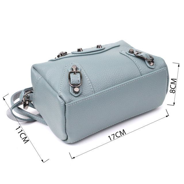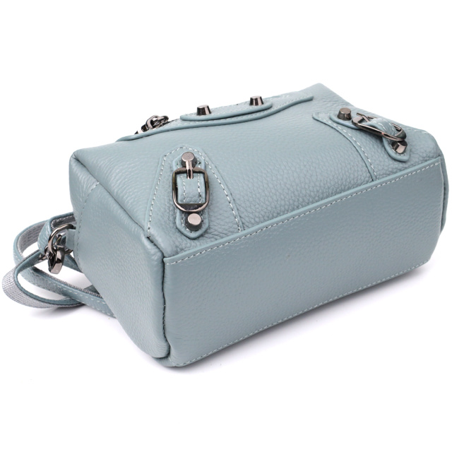 Небольшая женская кожаная сумка в голубом цвете с декоративной фурнитурой — свежий акцент с характером. Эта компактная модель выполнена из натуральной кожи в нежном голубом оттенке, который придает образу легкость и утонченность. Основное внимание в дизайне уделено декоративным деталям: металлические заклепки, ремешки и фигурная строчка на лицевой стороне добавляют стилю динамики и оригинальности.