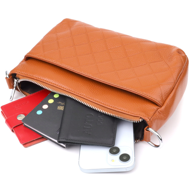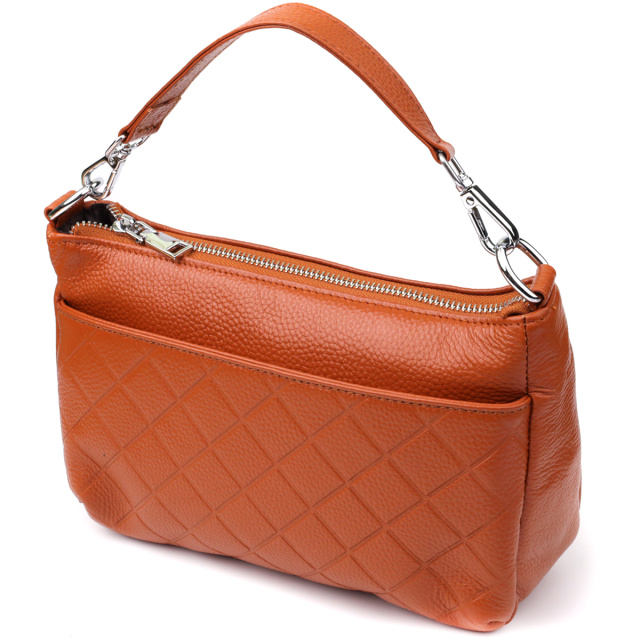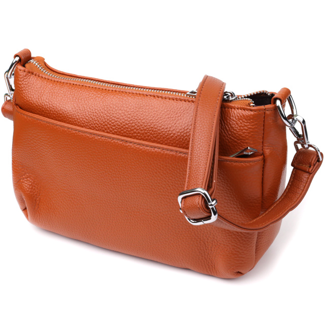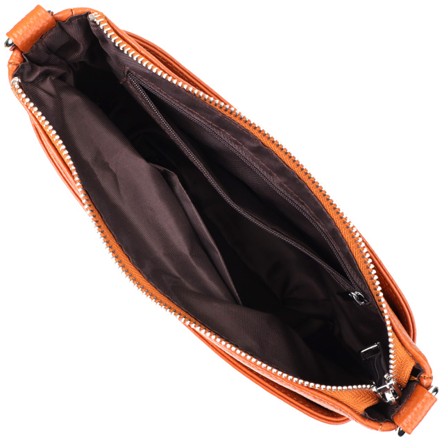 Стильная и практичная сумка из натуральной рыжей кожи, которая станет ярким акцентом в вашем образе. Основное отделение сумки закрывается на надежную молнию, обеспечивая безопасность ваших вещей. Внутри расположены удобный потайной карман на молнии — идеальное место для хранения ценных мелочей, и карман открытого типа для быстрого доступа к необходимым предметам.