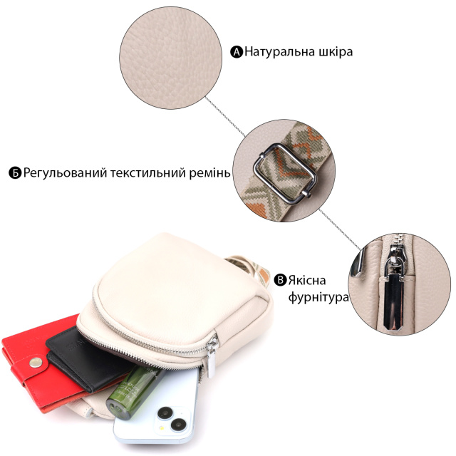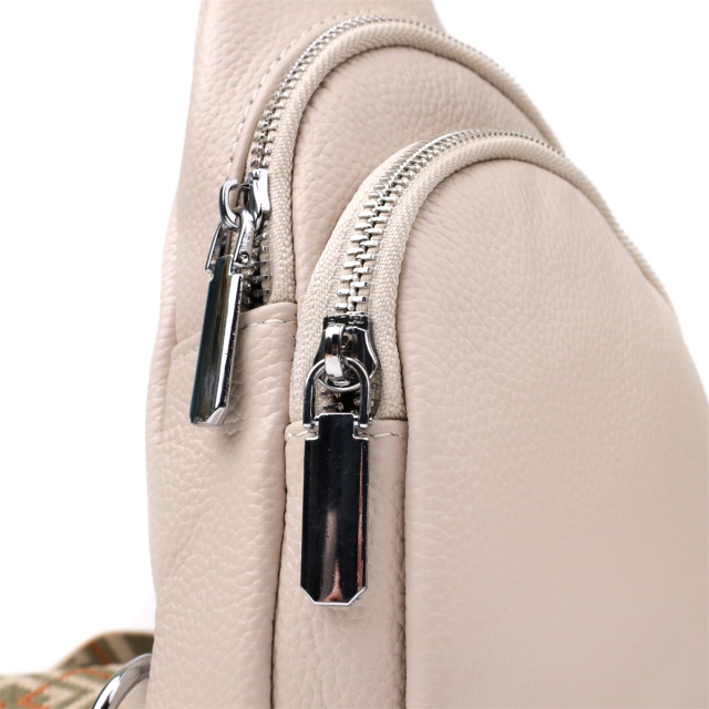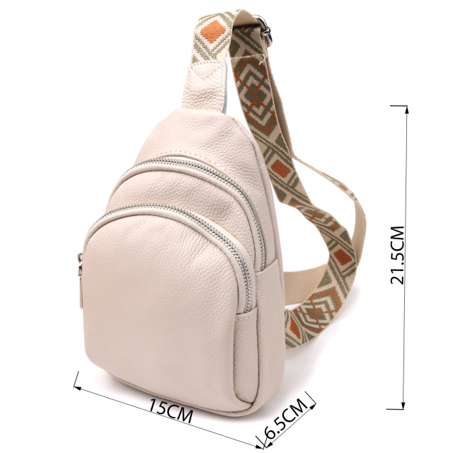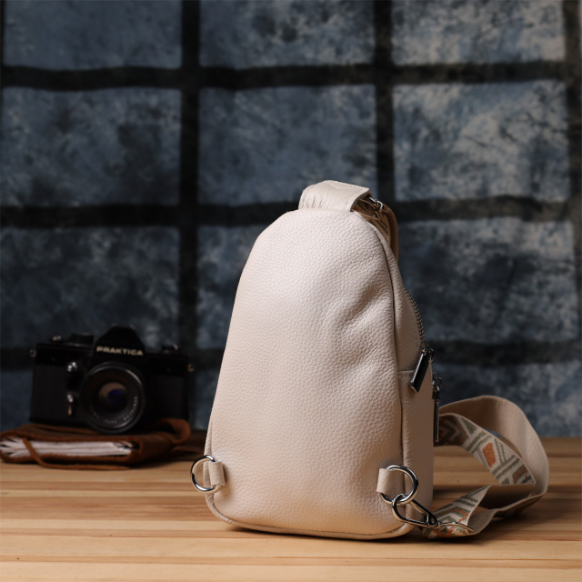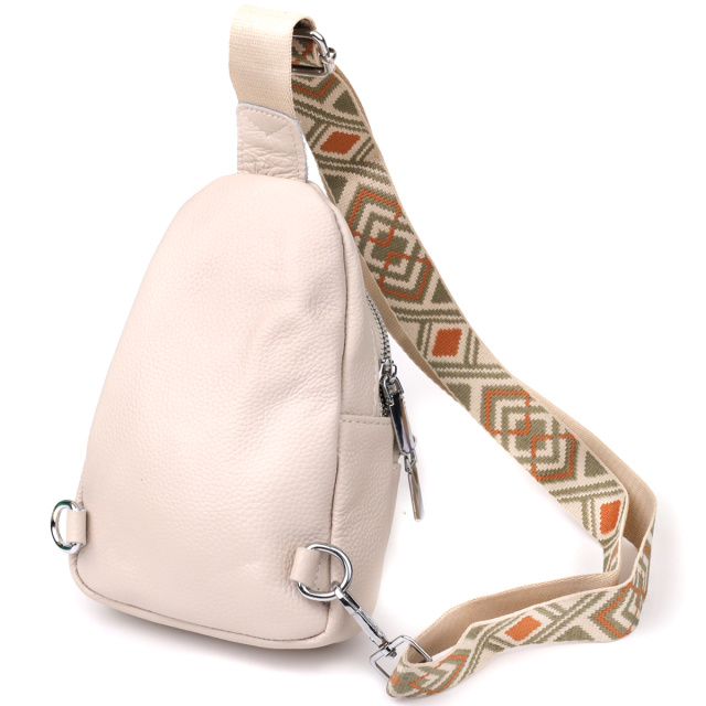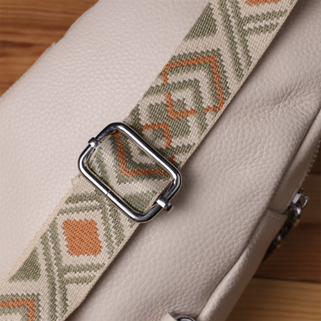 Особое внимание заслуживает регулируемый текстильный ремень с ярким стильным узором — он не только обеспечивает комфортную посадку на теле, но и становится выразительным элементом дизайна. Ремень несъёмный, но легко регулируется под ваш рост и способ ношения. Фурнитура выполнена в серебристом цвете, что придаёт аксессуару современный и сдержанный блеск, прекрасно сочетающийся с текстурой кожи и акцентами ремня.