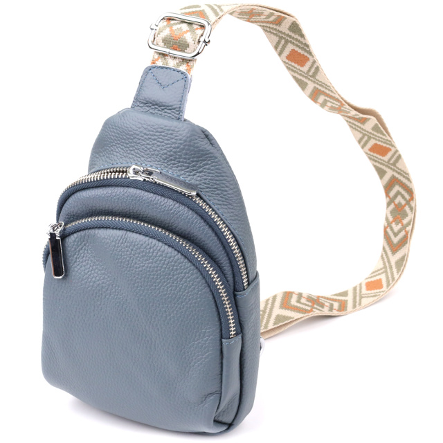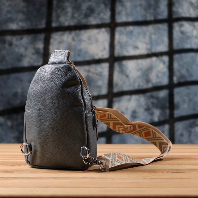 Особое внимание заслуживает регулируемый текстильный ремень с ярким стильным узором — он не только обеспечивает комфортную посадку на теле, но и становится выразительным элементом дизайна. Ремень несъёмный, но легко регулируется под ваш рост и способ ношения. Фурнитура выполнена в серебристом цвете, что придаёт аксессуару современный и сдержанный блеск, прекрасно сочетающийся с текстурой кожи и акцентами ремня.
