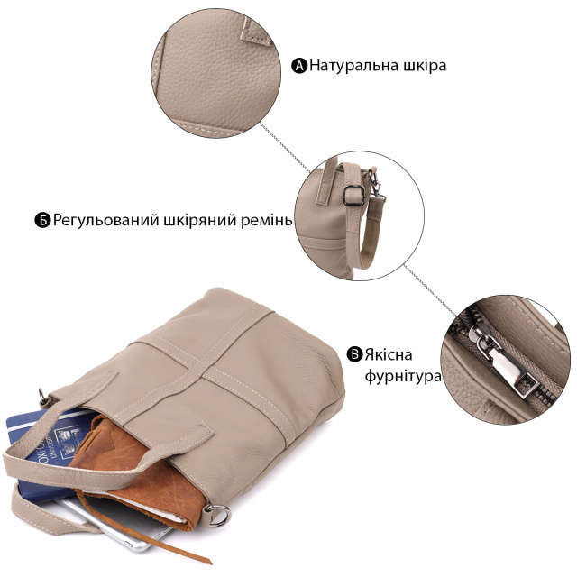 Цвет: серый; Материал: натуральная кожа; Размер (ШхВхГ, см): 24х26х11см; Длина ремешка: 116 см (регулируется в меньшую сторону ); Страна...