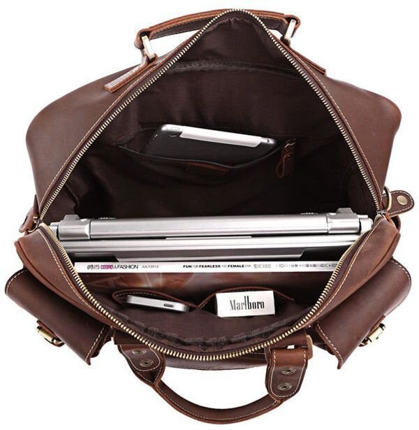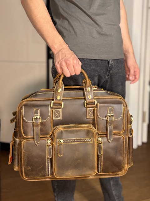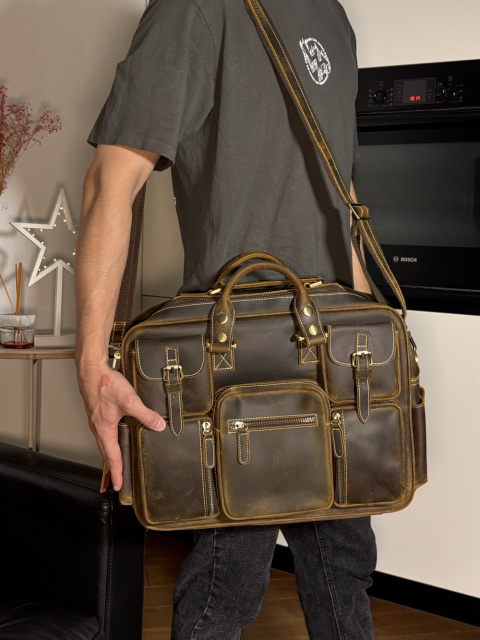 Представляем Вам отличную кожаную сумку из толстой качественной винтажной кожи. Это изделие можно отнести как к повседневным сумкам так и к кожаным дорожным сумкам(саквояжам). Сумка отлично исполнена - выглядит просто супер. По функциональности тяжело придумать лучшую сумку, она имеет множество карманов и очень удобна в эксплуатации, ее можно использовать для ноутбука.