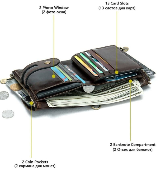 Уникальной особенностью такого кошелька является то, что вы сами можете регулировать объем заполнености кошелька. В аксессуаре 2 кнопочки. Огромный функционал впечатлит любого клиента. Кошелек совсем не прихотлив в использовании. И отлично носится годами. С таким функциональным кошельком вы точно ничего не забудете. Может быть прекрасным подарком для близкого человека.