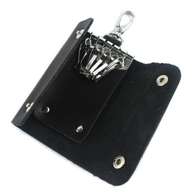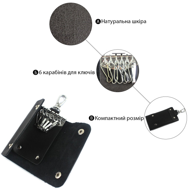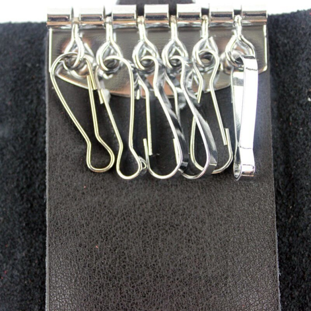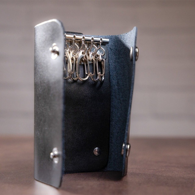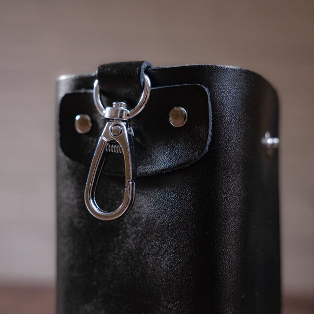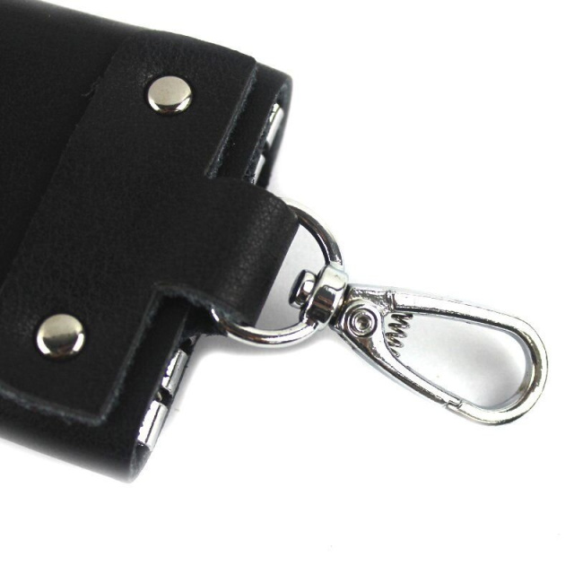 Роскошная ключница, черного цвета, изготовлена из натуральной кожи высокого качества. Состоит изделие из шести карабинов для ключей и внешнего карабина.