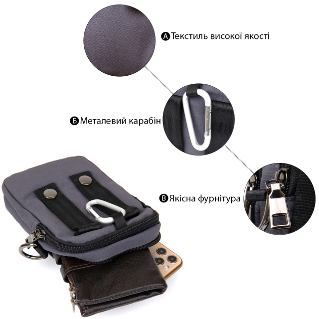 Особенности: поясной формат, два отделения, для города, поездок и повседневного использования.