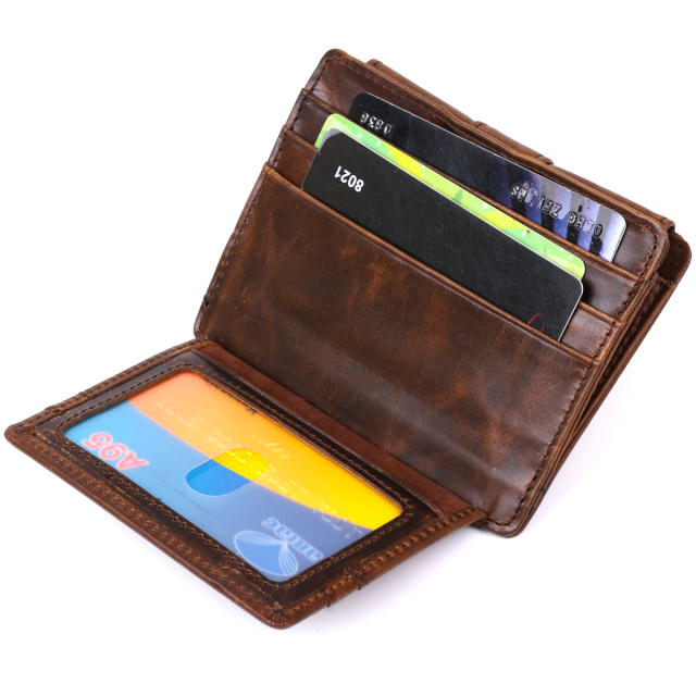 Оригинальный мужской кошелек небольшого размера из винтажной высококлассной кожи повышенной прочности. Имеет отделение для купюр, слоты для кредитных карточек, прозрачный кармашек и небольшую монетницу на кнопке. Такой кошелек занимает мало места, при это все необходимое будет всегда при Вас. Цвет изделия – коричневый, что смотрится очень красиво.