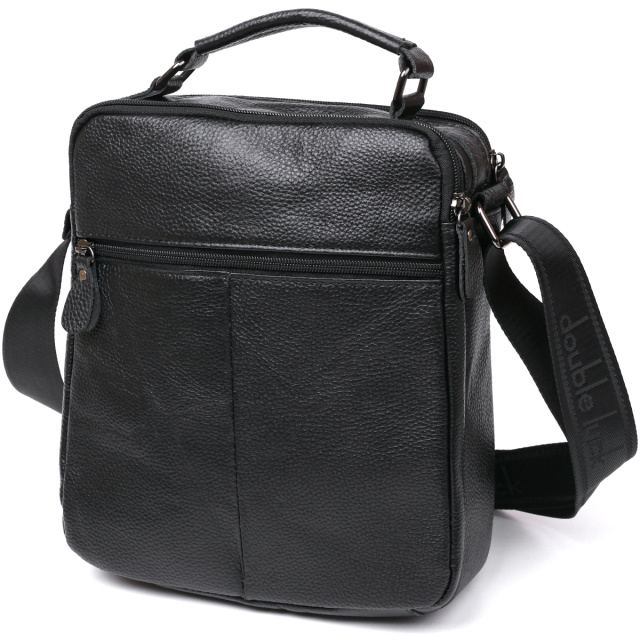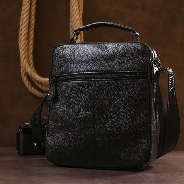 Вместительная мужская сумка стандартного размера из натуральной высокопрочной кожи. Имеет универсальный черный цвет и зернистую фактуру. Данная модель отлично подойдет тем, кому важно разместить все содержимое по отдельным карманам и отделениям. Сумку можно носить как в руке, так и через плечо. Ремень несъёмный, но регулируется по длине.