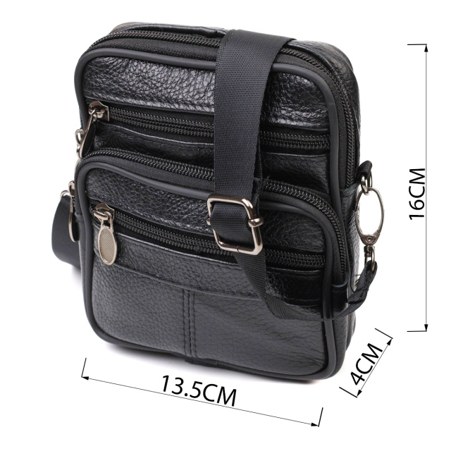 Мужская сумка на пояс, небольшого размера из натуральной кожи. Аксессуар отлично подойдет как для работы, так и в дорогу. Сумка состоит из основного отделения, что закрывается на молнию и трех карманов снаружи, они также закрываются молниями. Носить сумку можно на поясе, есть специальная кожаная петелька с тыльной стороны, а также в комплекте идет съемный текстильный плечевой ремешок. Модель очень практичная и универсальная. Изделие станет прекрасным подарком для любого мужчины.