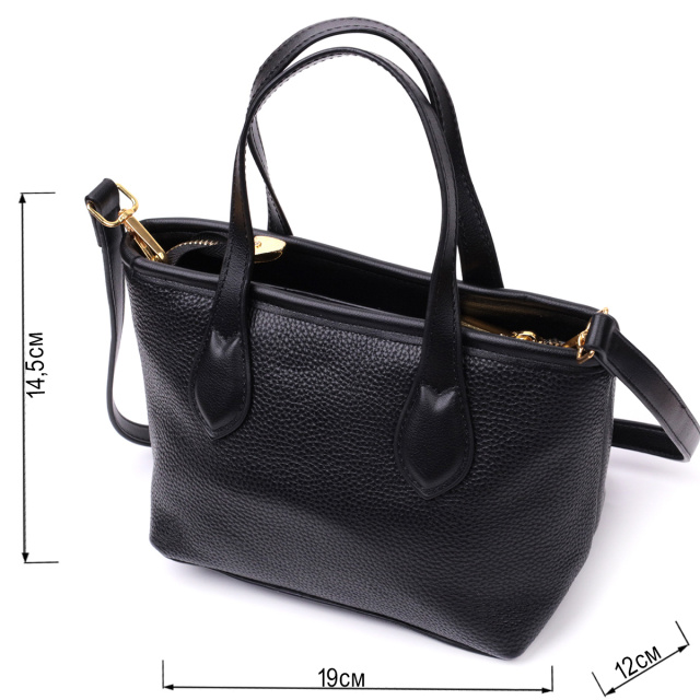 Женская сумка на каждый день из натуральной кожи флотар, которая неприхотлива в уходе и долго носится. Аксессуар состоит из одного основного отделения, потайного кармана на молнии и кармана открытого типа. Носить сумку можно в руке, на плече и через плечо, для этого имеются кожаные ручки и съемный кожаный ремень. В аксессуаре использована качественная фурнитура цвета желтого золота. Кожаная сумка - лучший подарок для любой девушки.