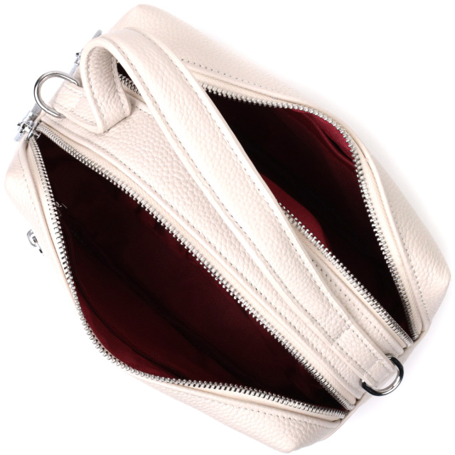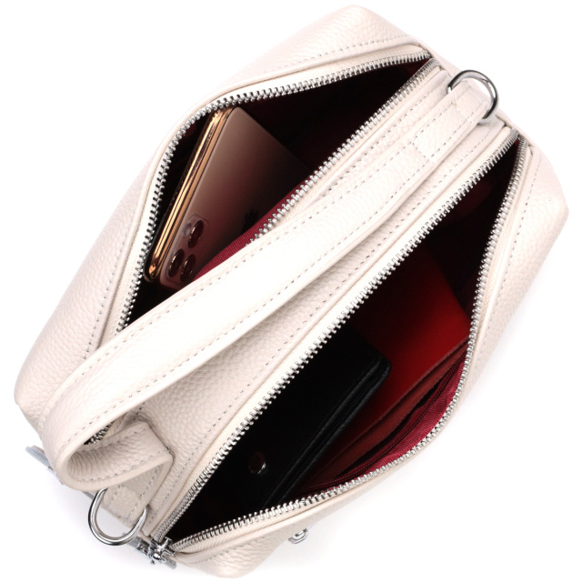 Оригинальная женская сумка на два автономных отделения из натуральной кожи флотар, которая неприхотлива в уходе и долго носится. Аксессуар состоит из двух основных отделений, потайного кармана на молнии, кармана открытого типа и кармана на молнии снаружи. Носить сумку можно в руках, на плече и через плечо, для этого имеется кожаная ручка и текстильный съемный ремень. В изделии использована качественная фурнитура цвета серебра. Универсальный вариант сумки как на вечер так и в качестве сумочки на каждый день.