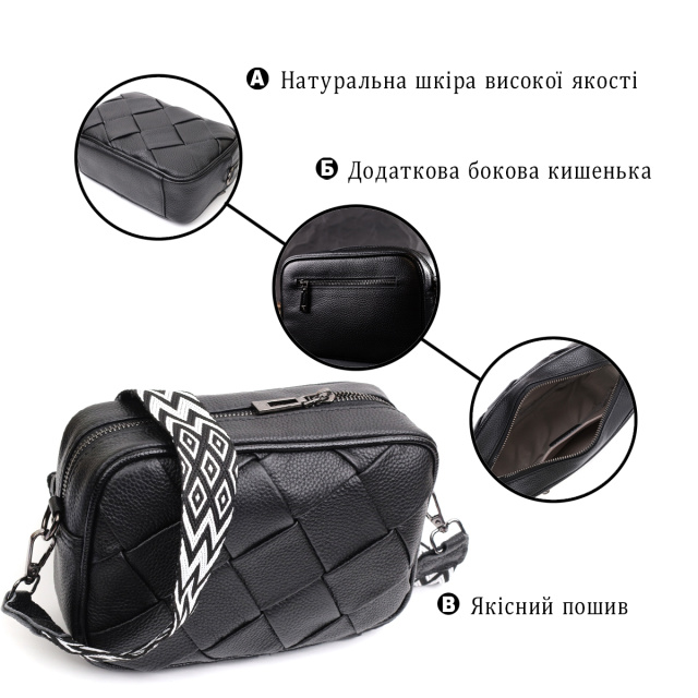 Красивая женская сумка с ромбовидными переплетами на лицевой стороне. Изделие пошито из качественной натуральной кожи, которая долго носится и не теряет свой первоначальный вид. Аксессуар состоит из одного основного отделения внутри которого расположен карман открытого типа и карман на молнии, также снаружи расположен карман на молнии, на тыльной стороне. Носить сумку можно в руке как клатч, на плече и через плечо, для этого имеется текстильный съемный ремень. В изделии использована качественная фурнитура цвета темного серебра. Универсальный вариант сумки как на вечер так и в качестве сумочки на каждый день.