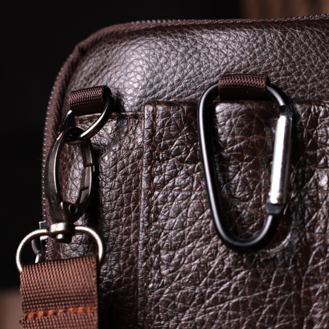 Небольшая вертикальная кожаная сумка которая с легкостью сможет заменить Вам барсетку. Особенностью сумки является то, что вы можете носить ее, повесив на свой ремень за петельку на тыльной стороне сумки или закрепить ее на карабин, а также на плече, для этого предусмотрен текстильный съемный ремешок. Маленькая сумка - очень практичный вариант для водителей, путешественников, а также для практичных мужчин, которые любят чтобы все было под рукой. Прослужит модель Вам далеко не один год. В комплекте к изделию идет пылезащитный чехол.