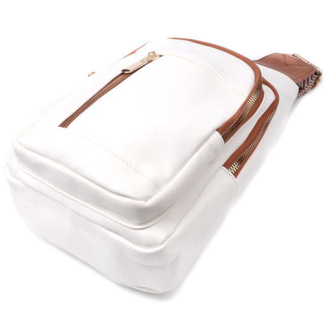 Красивая слинг сумка из качественной экокожи, в белом стильном цвете с коричневыми акцентами. Экокожа - высококачественная альтернатива натуральному материалу, которая очень устойчива к трению, к низким температурам, отлично носится в отличии от других искусственных материалов, а также имеет гипоаллергенный состав в отличии от натуральной кожи. Данная модель состоит из одного основного отделения которое закрывается на молнию и в котором находится потайной карман, а также трех карманов снаружи и одного отверстия для кабеля или наушников, что очень удобно в современной мире. Основной фишкой модели является удобный регулируемый плечевой ремешок из стильным узором. Отличный вариант сумки на каждый день и в любой сезон.