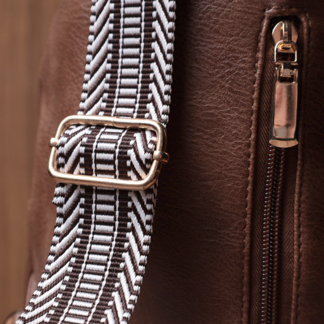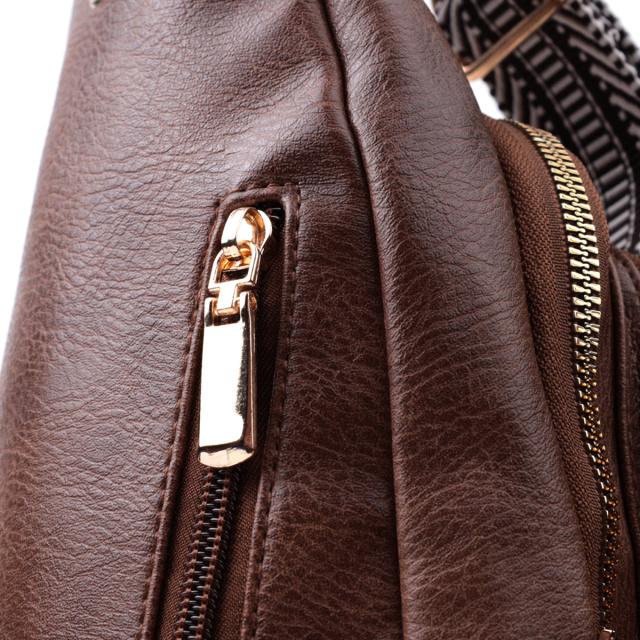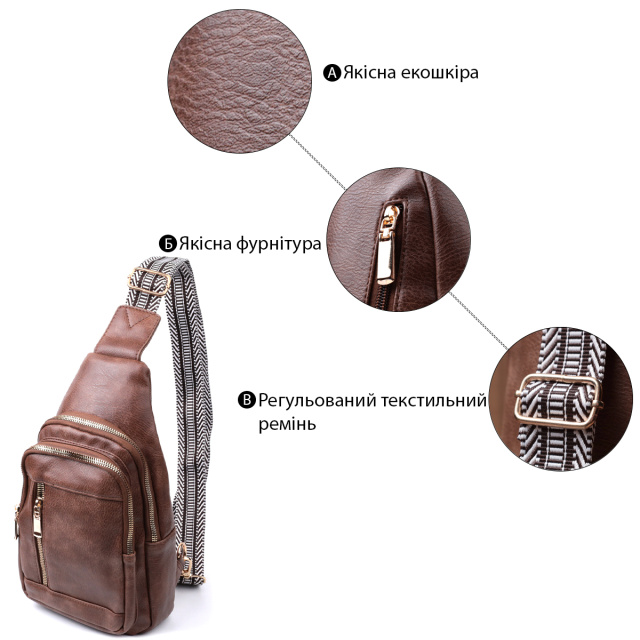 Практичная слинг сумка из качественной экокожи, в коричневом благородном цвете. Экокожа - высококачественная альтернатива натуральному материалу, которая очень устойчива к трению, к низким температурам, отлично носится в отличии от других искусственных материалов, а также имеет гипоаллергенный состав в отличии от натуральной кожи. Данная модель состоит из одного основного отделения которое закрывается на молнию и в котором находится потайной карман, а также трех карманов снаружи и одного отверстия для кабеля или наушников, что очень удобно в современной мире. Основной фишкой модели является удобный регулируемый плечевой ремешок из стильным узором. Отличный вариант сумки на каждый день и в любой сезон.