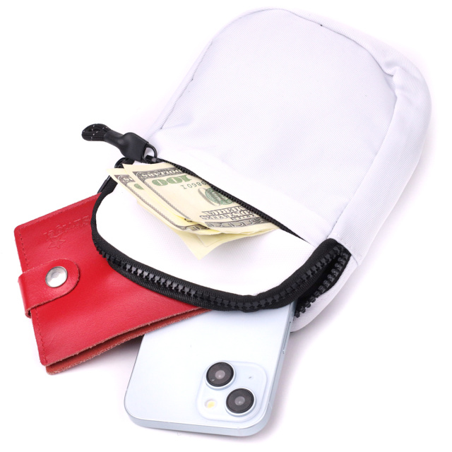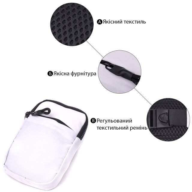 Представляем отличный вариант сумки слинг бег, которая подойдет как для повседневного использования, так и в путешествия, когда все ценные вещи должны быть в безопасном месте и под рукой. Аксессуар изготовлен из качественного текстиля белого цвета, с контрастными вставками черного цвета, что придает ему эксклюзивного вида и стиля. В модели использована качественная фурнитура черного цвета. Сумка легко вмещает паспорт, телефон, ключи, кошелек и еще несколько мелочей. Если Вы ищете удобную и легкую сумку, которая удовлетворит Вас по таким параметрам, как - прочность, практичность, вместительность, эксклюзивность, универсальность, то эта модель перед Вами, она обладает всеми вышеперечисленными качествами и станет одним из Ваших любимых аксессуаров.