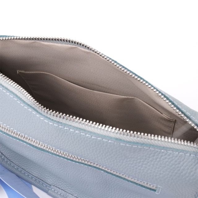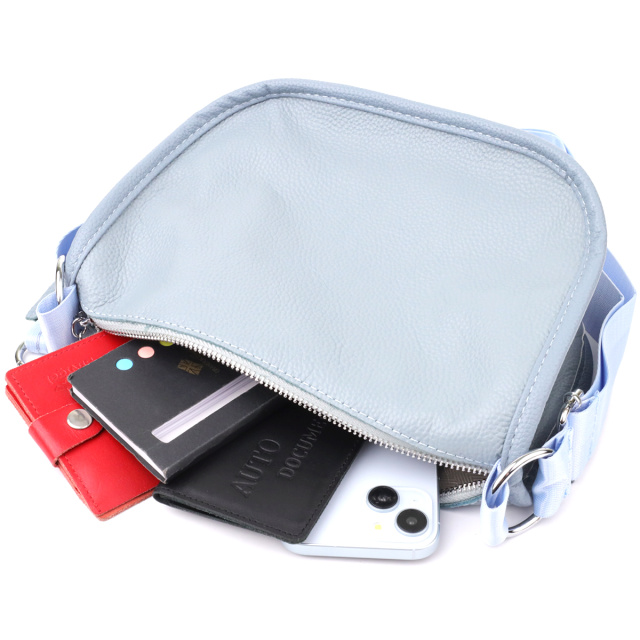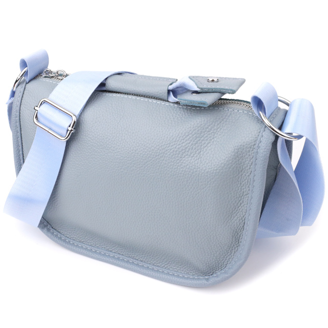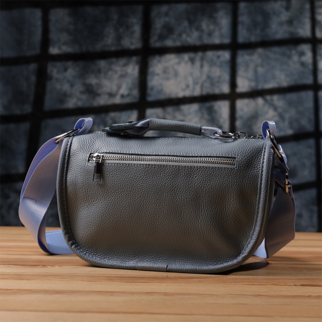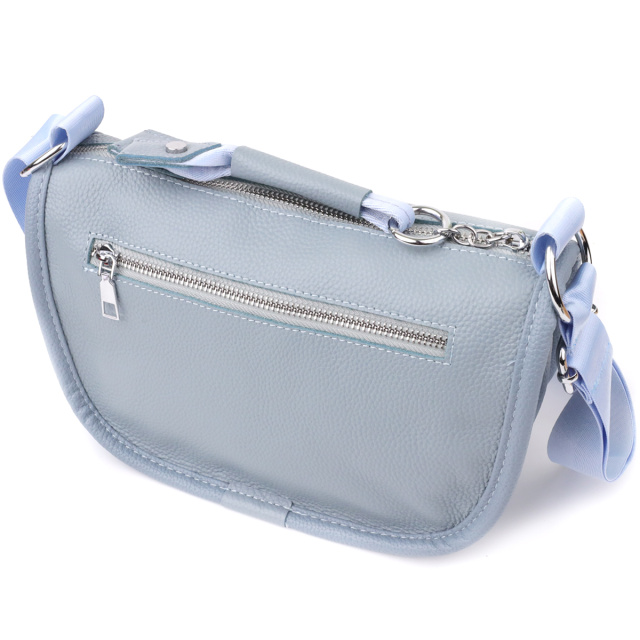 Женская кожаная сумка в серо-голубом цвете выполнена из качественной зернистой кожи и имеет полукруглую аккуратную форму, подчеркивающую современный и элегантный стиль. Особый акцент модели — декоративный бегунок в виде стильного брелка, который добавляет индивидуальности и изысканности. Сумка закрывается на молнию, внутри расположено основное отделение с двумя карманами на молнии и двумя открытыми карманами для мелочей, на тыльной стороне есть внешний карман на молнии. Несъемный текстильный ремень обеспечивает комфортное ношение, а фурнитура под серебро гармонично оттеняет холодный серо-голубой тон кожи. Эта сумка станет универсальным аксессуаром для повседневного использования и особых случаев, сочетая практичность и стиль.