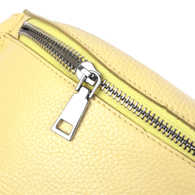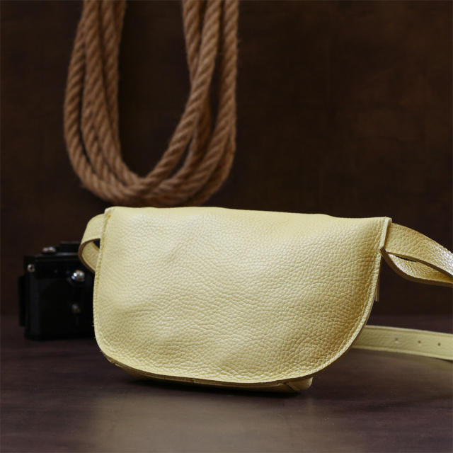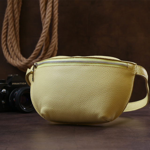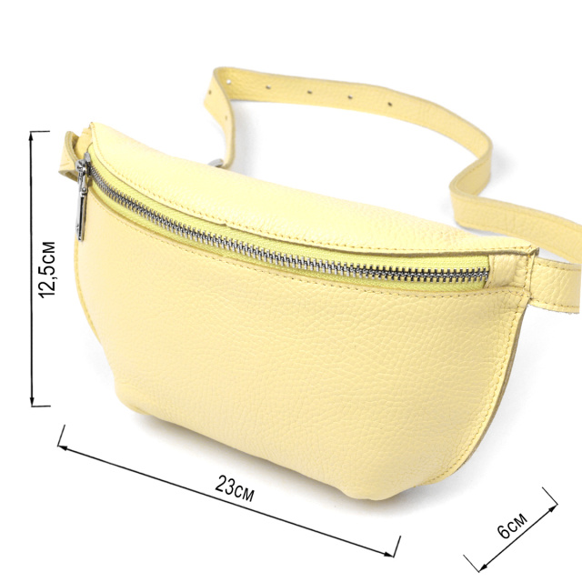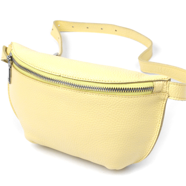 Відмінна жіноча сумка на пояс у приємному соковитому лимонному кольорі з натуральної висококласної шкіри з відмінними характеристиками. Має одне широке відділення. Фактура моделі має матову зернисту поверхню. Фурнітура представлена у срібному кольорі. Дана модель – чудовий подарунок коханій дівчині, подрузі чи сестрі.