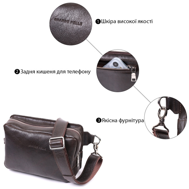 UA MarketКиївJANAТовари та послугиПоясные сумкиПрямокутна сумка бананка з якісної натуральної шкіри GRANDE PELLE 22575 Коричневий