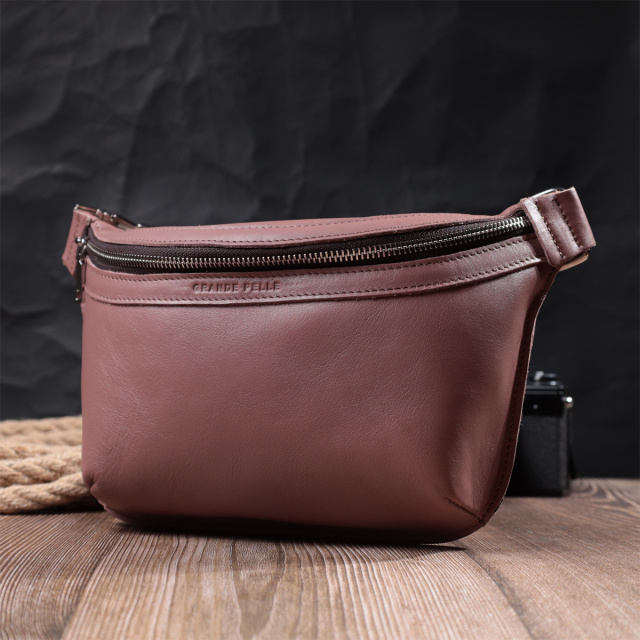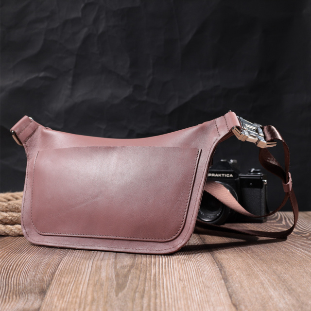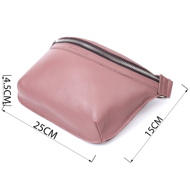 Стильна жіноча поясна сумка з натуральної люксової шкіри, в красивому бежево-рожевому кольорі. Складається модель з одного просторого відділення, в якому знаходиться кишеня відкритого типу та кишені на тильній стороні зовні. Вона виглядає дуже сучасно, завдяки красиво підібраній фурнітурі кольору срібла, елегантним рівним рядкам та якісній шкірі, яка переливається на сонці. Ідеальний подарунок для близької людини. Сумочка упакована у якісний фірмовий повстяний чохол.