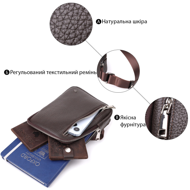 На вигляд компактна сумка через плече, але насправді вона дивує своєю місткістю і зручністю. Такий аксесуар особливо незамінний у подорожах та активних буднях, коли важливо тримати під рукою все найцінніше і найнеобхідніше. Модель виготовлена виключно з натуральної італійської шкіри флотар преміальної якості – матеріалу з вишуканим матовим блиском та приємною зернистою текстурою. Аксесуар доповнений надійною фурнітурою сріблястого кольору, а акуратні рівні шви підкреслюють високу якість виконання. Ця сумка – універсальне та стильне рішення для сучасного чоловіка. Вона органічно впишеться як у діловий, так і у повсякденний образ, підкреслюючи вашу індивідуальність, смак та увагу до деталей. Ідеальний союз практичності, комфорту та витонченого стилю.