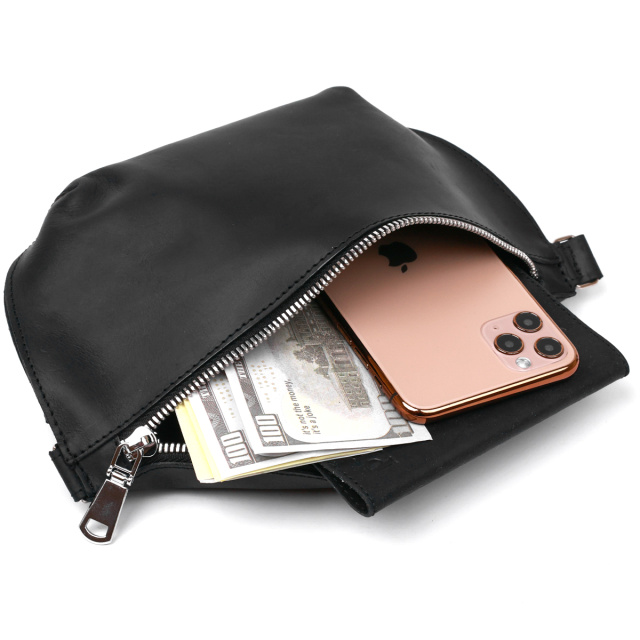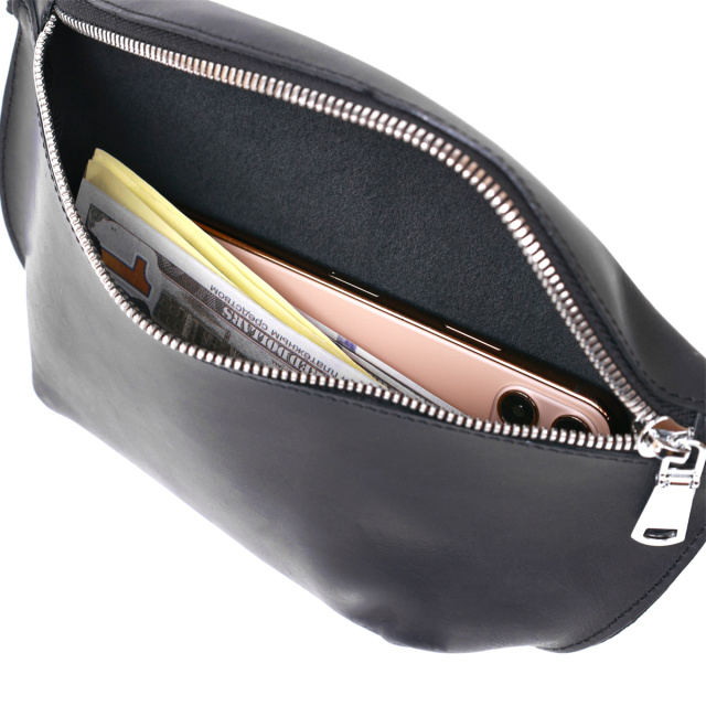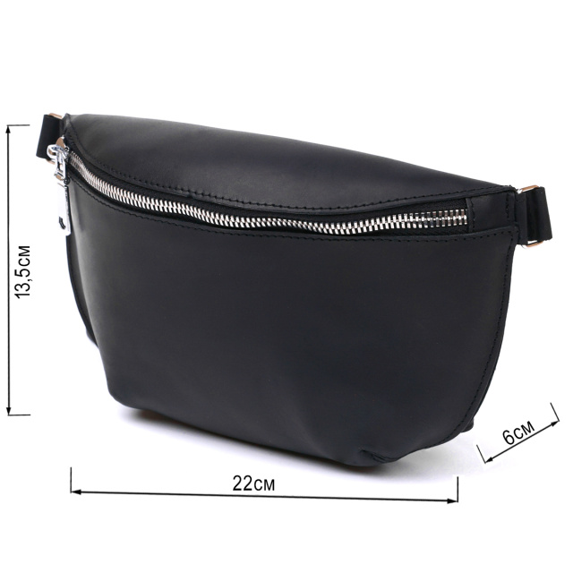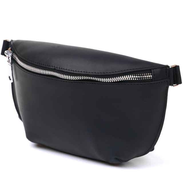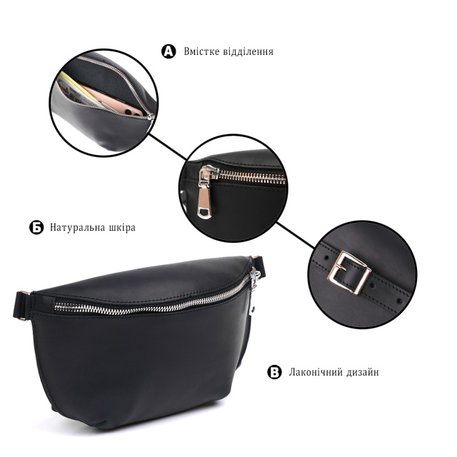 Практична жіноча сумка на пояс у красивому та елегантному дизайні без надмірностей від українського виробника. Матеріал виготовлення – натуральна шкіра високої якості із відмінними експлуатаційними характеристиками. Сумка має універсальний чорний колір та гладку матову фактуру. Ремінь зроблений також із натуральної шкіри і може регулюватися по довжині.
