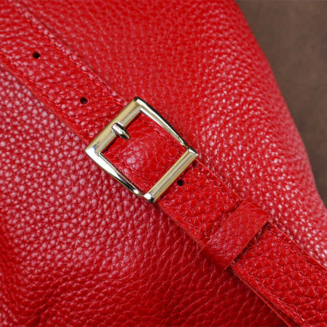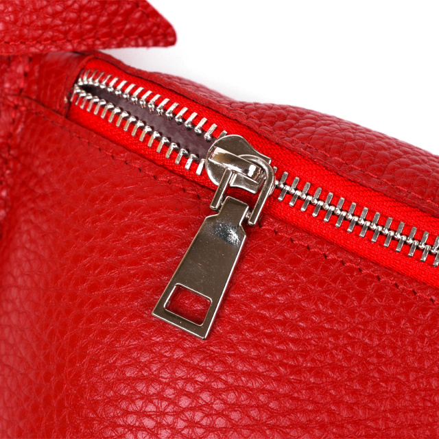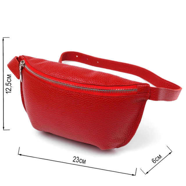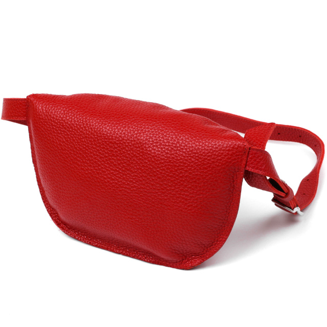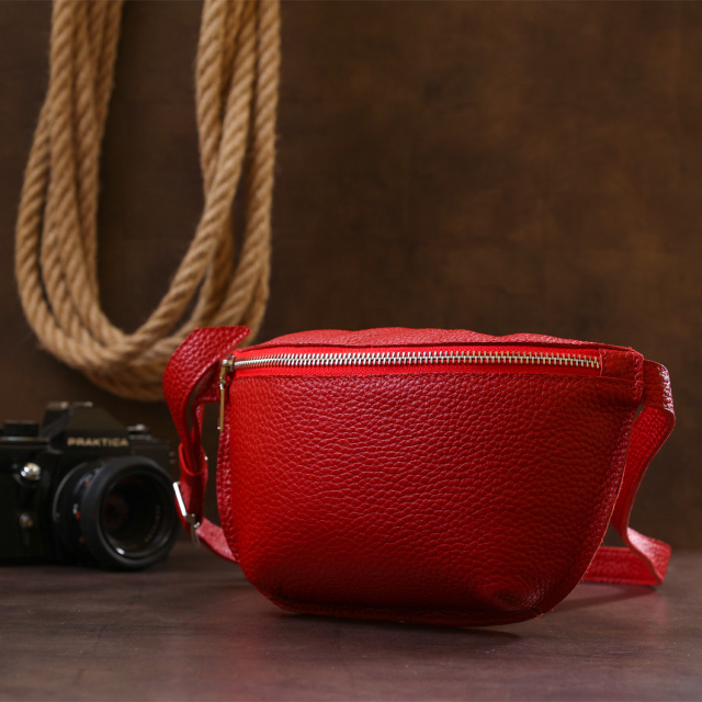 Стильна жіноча бананка із натуральної зернистої шкіри у яскравому червоному кольорі. Має одне просторе відділення, куди легко помістяться ключі, телефон та інші негабаритні речі. Ремінь також виконаний із натуральної шкіри і може регулюватися по довжині. Фурнітура представлена у срібному кольорі.