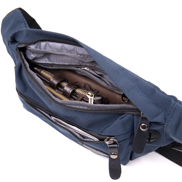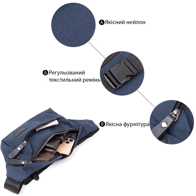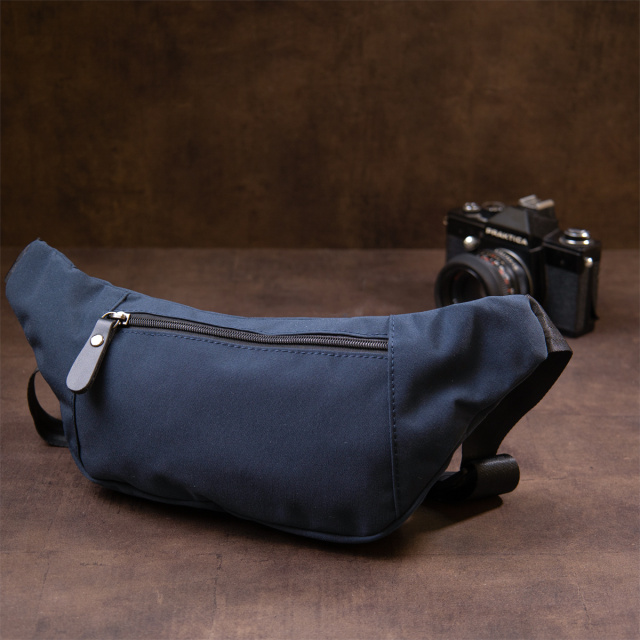 Компактна бананка з нейлону синього кольору. Аксесуар має невеликий розмір і практичний функціонал. Сумка дуже легка і зручна. З бананкою всі ваші особисті речі будуть під рукою і перед вашими очима. Аксесуар доповнено якісною фурнітурою і щільною підкладкою. Бананка підійде як для чоловіків так і для жінок. З такою сумкою зручно також ходити на заняття спортом або подорожувати. На нашому сайті виріб є в різних кольорах. Рекомендуємо вам бананку в якості зручної і бюджетної сумки.