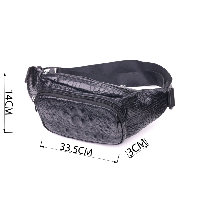 Модна поясна сумка для чоловіків з натуральної шкіри шкіри високої якості, з тисненням під крокодила. Бананка – одна із найпопулярніших моделей серед наших клієнтів. Така сумка стане дуже практичною та незамінною для будь-якого чоловіка. Сумка має одне основне відділення, три кишені зовні. Металева фурнітура представлена у сріблястому кольорі. Виріб стане чудовим подарунком для близької людини.