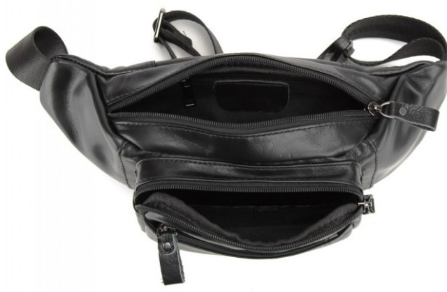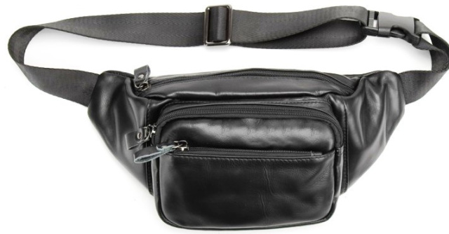 Чоловіча сумка на пояс виготовлена з натуральної шкіри чорного кольору.