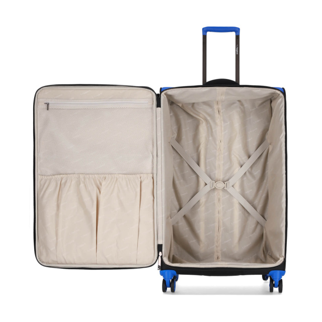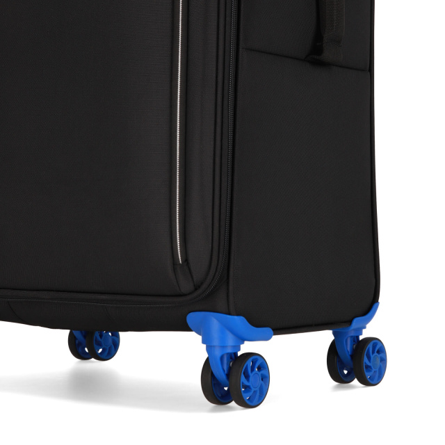 Для безпеки багажу валіза обладнана вбудованим кодовим замком. Завдяки колесам, що обертаються на 360 градусів, валіза плавно рухається в будь-якому напрямку, а зручна телескопічна ручка та додаткова ручка збоку полегшують транспортування.