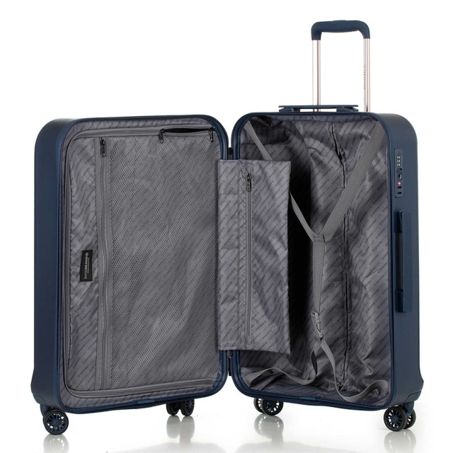 - Валіза має текстильну перегородку на блискавці, яка розділяє внутрішній простір на два основні відділення, перегородка має сітчасту кишеню на блискавці.