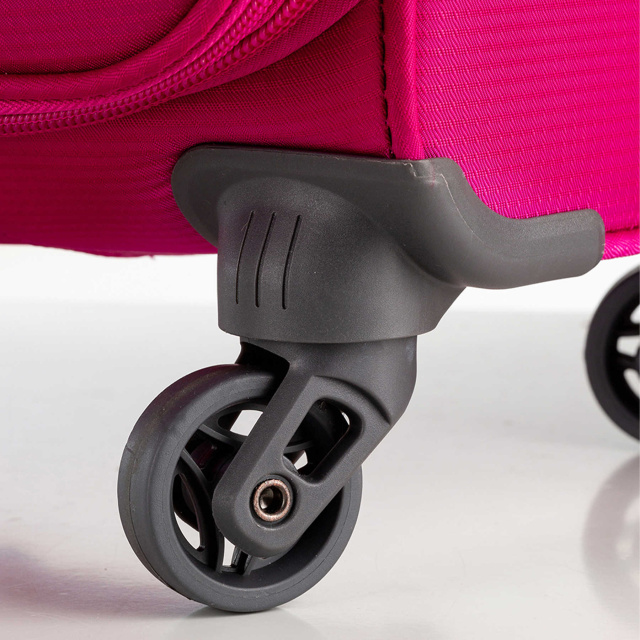 - FOUR WHEELS LUGGAGE - дана модель оснащена чотирма колесами, що обертаються на 360°. На відміну від деяких бюджетних моделей конкурентів, дана модель має не малі, а повнорозмірні колеса з широким профілем, які забезпечують плавне кочення, кращий розподіл ваги, стійкість, а головне мають більшу зносостійкість. Колеса кріпляться на 4 гвинти зсередини, що забезпечує високу стійкість при ударному навантаженні з будь-якого боку, і дозволяє їх замінити у разі зношування.