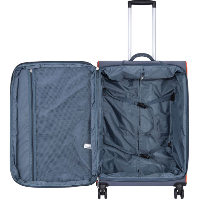 Валіза виготовлена з щільного оксфорду 600D меланж із водовідштовхувальними властивостями та має захисний каркас, який оберігає речі під час транспортування. Завдяки легкій вазі модель зручна для авіаподорожей, коли важливий кожен кілограм.