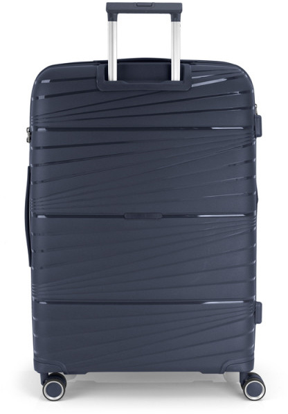 Валіза Gabol Kiba (L) Azul Marino (122047-046) оснащена чотирма повноповоротними колесами з можливістю незалежного розвороту кожного колеса на 360°. Системою передбачено рівномірний перерозподіл навантаження на кожне колесо, що у свою чергу сприяє плавному руху та маневреності валізи, докладаючи при цьому мінімум зусиль. Колеса виготовлені із високотемпературного термопластичного поліуретану (TPU). Матеріал має міцність порівнянну з пластиком, гнучкістю силікону, а також має підвищену стійкість до перепадів температур. Відмінною особливістю коліс із TPU матеріалу є зниження шуму до мінімуму під час руху валізи по нерівній поверхні. Завдяки стійкості до стирання матеріал коліс відрізняється тривалим терміном експлуатації.
