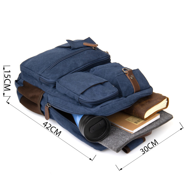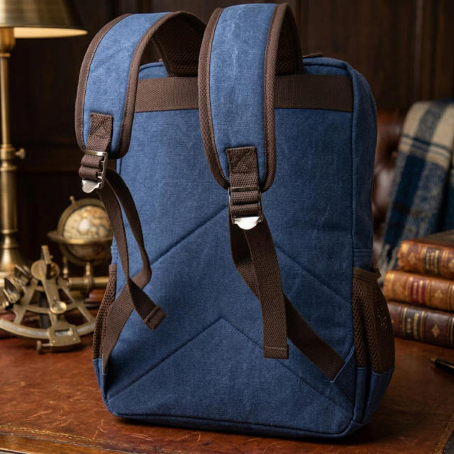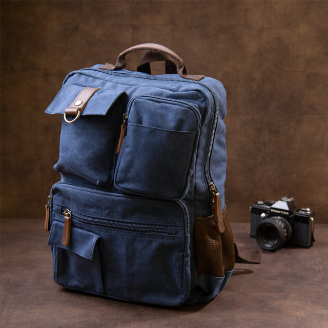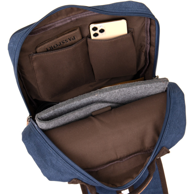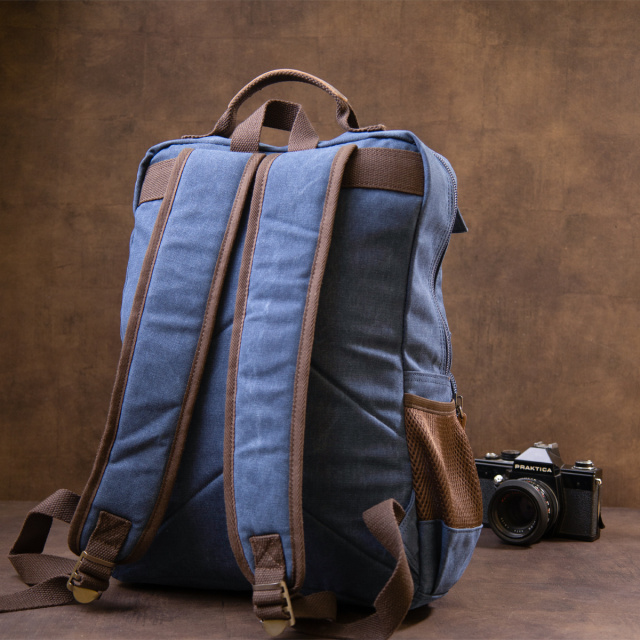 Виріб виконаний з текстилю синього кольору. Матеріал легкий, зручний у використанні та добре підходить для активної експлуатації. На сторінці товару зазначено, що рюкзак неважкий саме завдяки текстильному матеріалу, а синій колір є універсальним і немарким. Усередині передбачена якісна текстильна підкладка коричневого кольору.