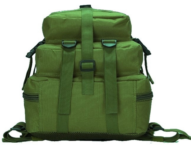 На лицьовій і бічних сторонах рюкзака нашиті MOLLE-стропи для навішування додаткового спорядження або підсумків.