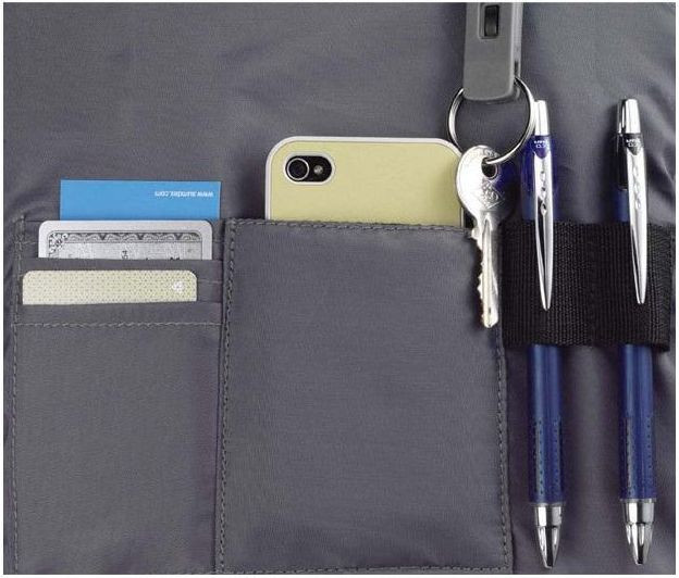 З лицьового боку є кишеня-органайзер: сітчаста кишеня, відсіки для авторучок/олівців, кишеня для дріб'язку, відсік на змійці, карабін знімний з кільцем для ключів.