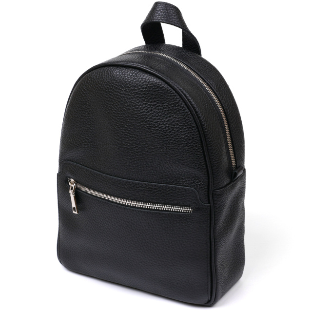 Практичний жіночий рюкзак із натуральної шкіри високої якості виконання. Має зернисту фактуру та універсальний чорний колір, тому підійде під будь-який одяг. Основне відділення дуже містке та просторе, на зовнішній стороні передбачена невелика кишеня на блискавці.