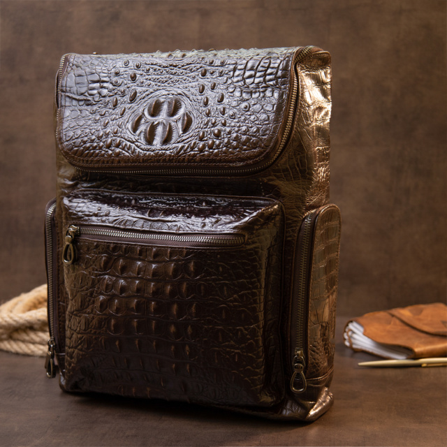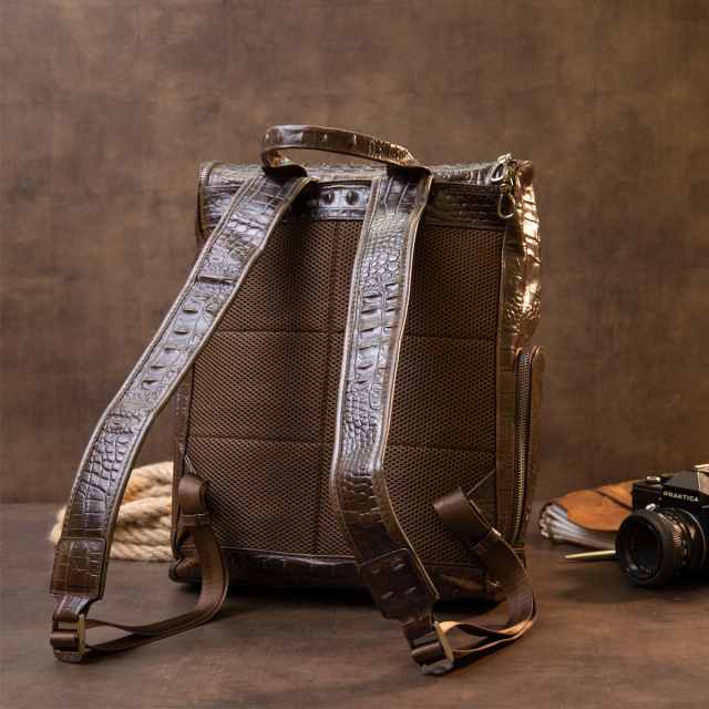 Місткий рюкзак з щільної, блискучої шкіри, яка тримає форму. Аксесуар виконаний в коричневому кольорі і доповнений якісною фурнітурою сріблястого кольору. Виріб під рептилію. Рюкзак дуже функціональний і практичний. Підійде дана модель як для подорожей, так і на кожен день і як рюкзак для ноутбука. Виглядає дуже солідно і дорого. З таким рюкзаком буде зручно і ваші руки залишаться вільними. На тильній стороні ущільнена спинка сіткою для вашого комфорту. Рекомендуємо рюкзак до покупки як для себе, так і на подарунок.