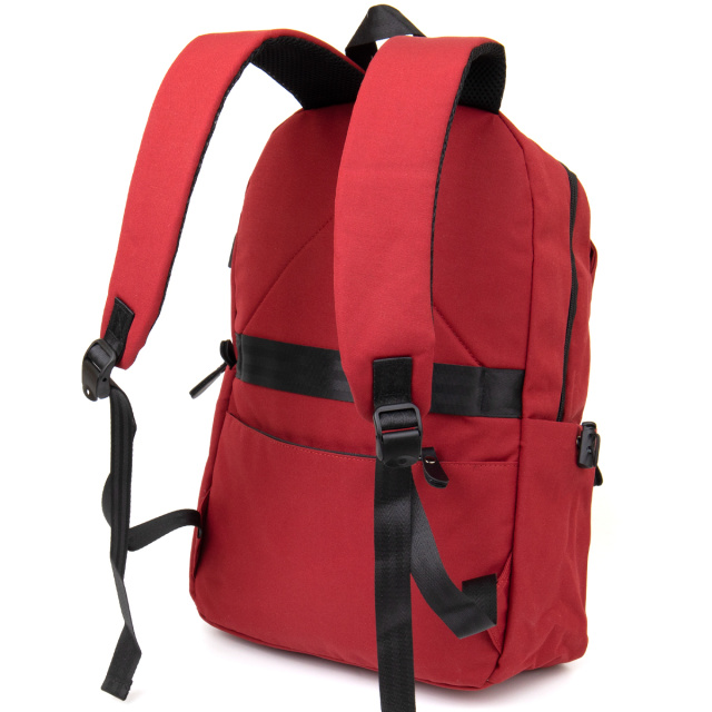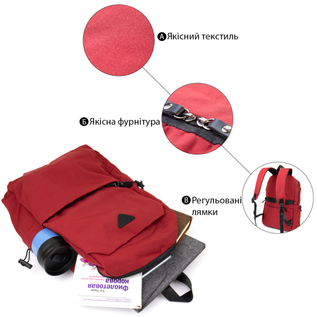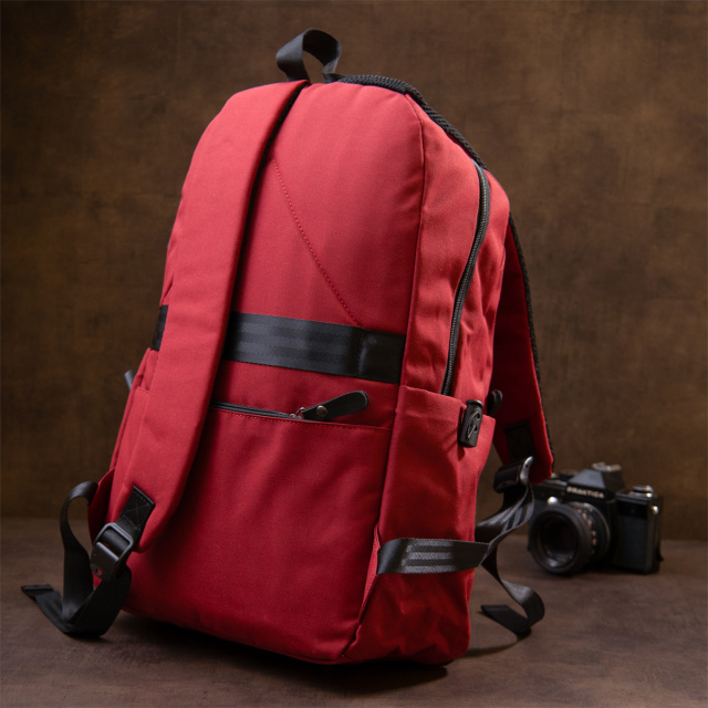 Виріб виконаний з текстилю малинового кольору. Матеріал легкий, зручний у використанні та добре підходить для активної експлуатації. На сторінці товару окремо зазначено, що рюкзак створений для сучасного користувача, який не уявляє своє життя без гаджетів. Малиновий колір виглядає яскраво та допомагає виділитися, а сам рюкзак залишається практичним для міста, відпочинку й дороги.