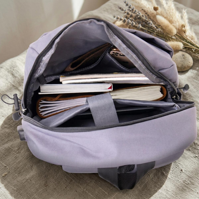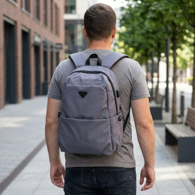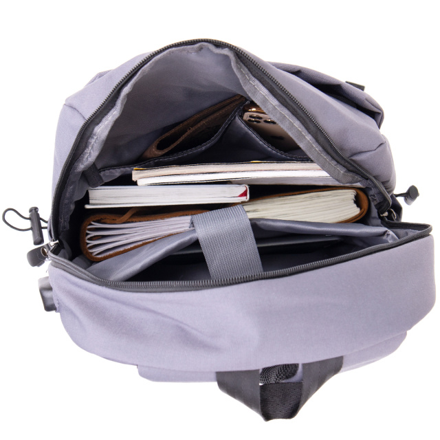 Модель має основне відділення на блискавці. Усередині передбачені дві накладні кишені для мобільного та ущільнена кишеня на липучці під ноутбук. Така конструкція робить рюкзак зручним для роботи, навчання та поїздок. У комплекті йде USB-шнур, а сам рюкзак доповнений відповідним роз’ємом, що особливо зручно для щоденного використання.