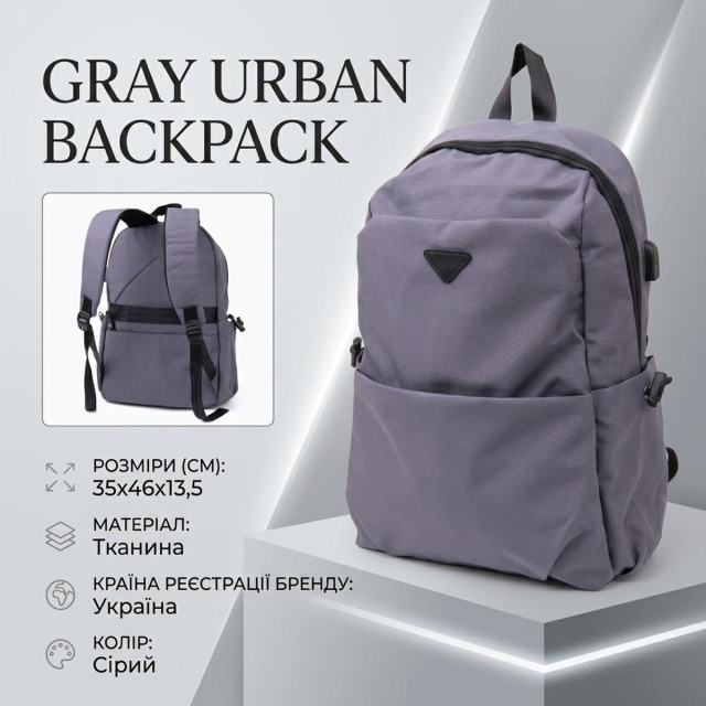 Виріб виконаний з текстилю сірого кольору. Матеріал легкий, зручний у використанні та добре підходить для активної експлуатації. На сторінці товару окремо зазначено, що рюкзак створений для сучасного користувача, який не уявляє своє життя без гаджетів. Сірий колір виглядає універсально і практично для міста та дороги.