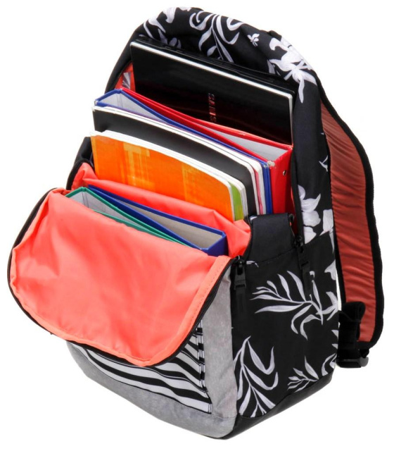 Рюкзак Roxy Here You Are виділяється ніжними квітами і яскравими квітковими і смугастими принтами. У його модному дизайні є все, щоб спокусити молодих дівчат завдяки кораловим деталям, особливо на лямках. Він підходить для використання як дорослими людьми, так і школярами або студентами. Для цього він сумісний з форматом А4, що дозволяє перевозити ноутбук і, що ще гірше, оснащений ергономічною системою перенесення. Продуманий до найдрібніших деталей, він виготовлений із поліестеру, що забезпечує йому досить гарну міцність.