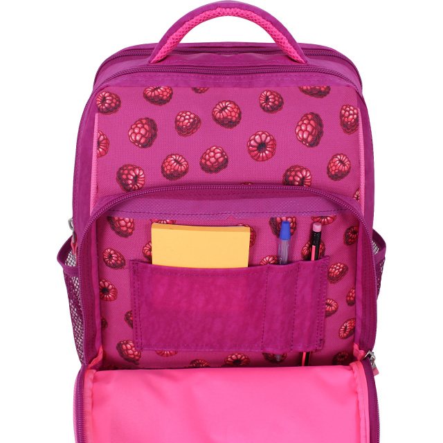 У рюкзаку — два просторі відділення на блискавці, де легко помістяться підручники, зошити або улюблені іграшки. Є також менше за розміром відділення з органайзером для канцтоварів — з ним можна обійтися без пенала. Спереду розташована зручна кишеня на блискавці для дрібниць — наприклад, телефону чи ключів. По боках — сітчасті кишені для пляшки з водою або термоса.
