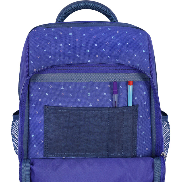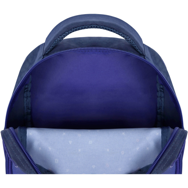 У рюкзаку — два просторі відділення на блискавці, де легко помістяться підручники, зошити або улюблені іграшки. Є також менше за розміром відділення з органайзером для канцтоварів — з ним можна обійтися без пенала. Спереду розташована зручна кишеня на блискавці для дрібниць — наприклад, телефону чи ключів. По боках — сітчасті кишені для пляшки з водою або термоса.